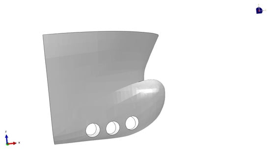 A collision between a vessel and semi-submersible platform is usually of one of the following main types: a bow collision, a side collision, or a stern collision. Since in the case of supply vessels, a bow collision with the platform column is much more dangerous than other collisions, this type was chosen as the research object in this paper. We mainly considered the collision force and collision depth of the semi-submersible platform. For this reason, only the bow part of the supply vessel was constructed when establishing the finite element model, and the model was simplified into a rigid model. The principal dimensions of the collision vessel considered in our study are shown in Table 2, and the finite element model is shown in Figure 3.