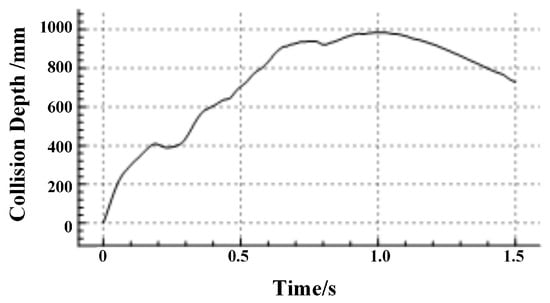The above condition was selected as a typical working condition to analyze the load, structural damage, and energy conversion during the collision. The collision depth changes under the typical working condition chosen, as shown in Figure 5. It can be seen that the collision depth of the supply vessel reaches a maximum of 987.5 m at 1.0 s after the collision, and the remaining energy of the vessel is not sufficient to resist the elastic deformation of the platform components. The effective contact area is then reduced by the reverse movement of the vessel, so the collision depth is gradually decreased.