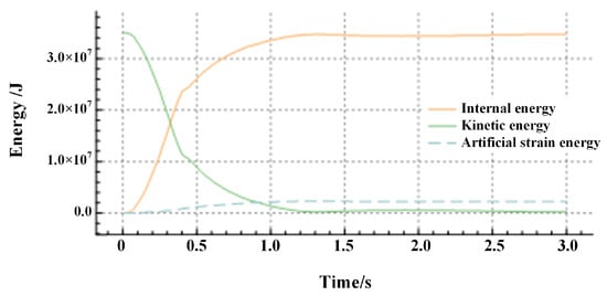 The energy conversion duration curve of the collision system under the typical working condition is shown in Figure 6. It can be observed that the energy of the system continuously decreases, while the internal energy and hourglass energy constantly increase during the entire collision process. That is to say, the energy of the system is converted into internal energy and a small amount of hourglass energy. Meanwhile, combined with the trend of the curve changes, it can be observed that the total energy conversion follows the law of conservation of energy, as one part of the energy in the system decreases while the other part increases. The hourglass energy accounts for 4.6% of the internal energy of the platform, which meets the requirement of being below 5%. Therefore, the results of the nonlinear finite element dynamic analysis in this paper can be seen as reliable.