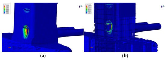 Damage deformation cloud image of the platform: (a) conditions of the outer plate; (b) conditions of the inner double-shell structure.