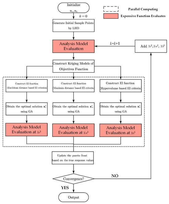 The algorithm consists of nine steps, organized in three principal phases. First, a Kriging surrogate model is constructed based on the set of sample points, as shown below in steps 1, 2 and 3 of the proposed algorithm. Second, a parallel hybrid criteria-based EI function is established, and the largest function value of each expected function is selected as the renewal point, as shown in steps 4 and 5. In each iteration, different EI functions should be optimized in parallel to select renewal points. Since the EI function is often multi-modal and highly nonlinear, it is usually necessary to use meta-heuristic optimization (possibly genetic) to find the maximum value. Since the EI function is an analytical expression, this calculation is so fast, compared with time-consuming simulation calculations, that its solution time can be seen as negligible. Third, the true response value of the renewal point is calculated and incorporated in the sample database, after which the approximate Pareto solution is obtained in the existing sample database, as shown in steps 6 and 7. In this way, the algorithm can obtain the Pareto solution by continuously selecting and calculating potential renewal points in parallel.