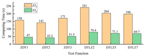 Moreover, the computing time for completing the same sample estimation using the optimization algorithm based on the EIp criterion was compared with that using the optimization algorithm based on a single criterion. Since the computing time required by optimization algorithms based on EIh, EIe, and EIm criteria are basically the same, the EIh criterion-based optimization algorithm was adopted for the comparison in this paper. In the two algorithms, a computer with the same configuration was utilized, with single-core computing for the algorithm based on the EIh criterion and parallel three-core computing for the algorithm based on the EIp criterion. To exclude the effect of initial sample points on experimental results, all experiments were run 30 times as per different initial schemes. The explicit core/thread counts and system specifications are listed in Table 11. The average computing times were taken and compared, as shown in Figure 21. It can be seen that the computing time required by the algorithm based on the EIh criterion was about three times that required by the algorithm based on the EIp criterion. This suggests that for all test functions, the algorithm proposed in this paper requires less computing time and can obtain relatively superior results, and it confirms that the algorithm proposed in this paper is superior in providing computational efficiency.