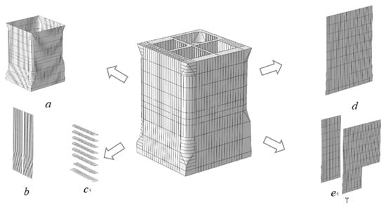 Figure 22a shows the outer plate of the column, with thickness x1. Figure 22b shows the longitudinal beam inside the outer plate, with thickness x2. Figure 22c shows the double-shell cross brace of the column, with thickness x3. Figure 22d shows the center line bulkhead of the column, with thickness x4, and Figure 22-e shows the longitudinal bulkhead at the side, with thickness x5. The upper and lower limits of the plate thicknesses (unit: mm) for each of the five design variables determined above are shown in Table 12.
