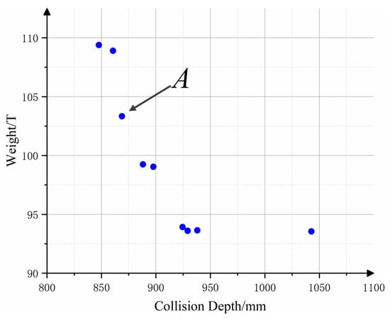 The nine points of the Pareto front obtained by the optimization through this method are represented by the blue dots in Figure 23. As seen in Figure 23, the Pareto front consists of nine non-dominated solutions. From the perspective of resolution, these nine points adequately capture the trade-off relationship between collision depth and weight across the observed range. Each point represents a distinct design compromise, and the spacing between adjacent points reflects meaningful differences in performance metrics. Regarding generalizability, while the current Pareto front is derived from a specific experimental or simulation setup, the nine-point distribution covers the critical regions of the design space where practical engineering trade-offs occur. Should a higher-resolution Pareto front be required for more granular decision-making, our methodological framework (e.g., the multi-objective optimization algorithm) can be extended with increased sampling or refined parameter settings, which we plan to explore in future work to further validate generalizability across broader design scenarios.