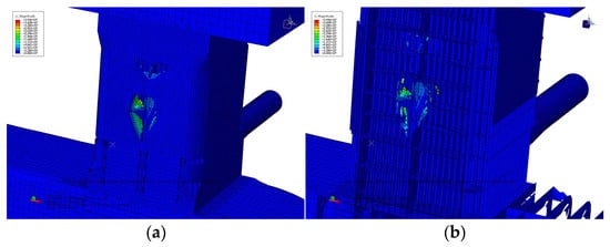 Damage cloud chart of the column structure in the optimized semi-submersible platform: (a) conditions of the outer plate; (b) conditions of the inner double-shell structure.