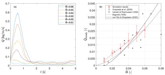 - Durán, O.; Andreotti, B.; Claudin, P. Numerical simulation of turbulent sediment transport, from bed load to saltation. Phys. Fluids 2012, 24, 103306. [Google Scholar] [CrossRef]