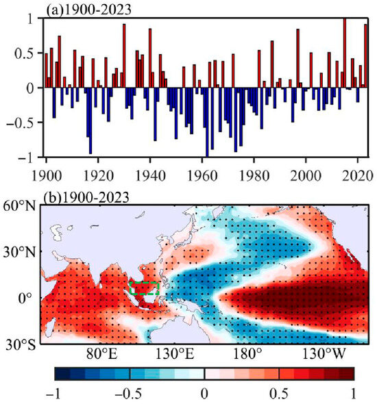 Relationship between SSCS SST anomalies and ENSO in the HadISST data set. (a) The time series of normalized D(0)J(1)F(1) southern SCS (SSCS) SST anomalies during 1900–2023. (b) Correlation map between the interannual variations in normalized D(0)J(1)F(1) Niño-3.4 index and the Indo-Pacific SST anomalies from 1900 to 2023. Stippling represents anomalies above the 99% confidence level. The green dashed box in (b) represents the SSCS.