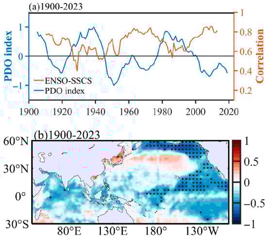 Connection between the interdecadal variation in El Niño core region (120–170° W, 5° S–5° N) SST-SSCS SST relationship and the PDO in the HadISST data set. (a) The 11-year running mean normalized PDO index (blue line) and interdecadal variation in El Niño core region (the tropical central-eastern Pacific) SST-SSCS SST relationship (orange line). The time-varying ESR is measured by the 21-year sliding correlation between the D(0)J(1)F(1) SSCS SST anomalies and D(0)J(1)F(1) Niño-3.4 index. (b) Correlation map between the interdecadal variation in El Niño core region SST-SSCS SST relationship and Indo-Pacific decadal SST anomalies from 1900 to 2023. The long-term linear trends in SST data were removed prior to the analysis. The black solid line in (a) represents both the PDO index of zero and the correlation at 99% confidence level. Stippling in (b) represents anomalies above the 95% confidence level using the effective number of degrees of freedom.