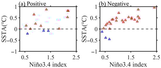 Based on the classification results (see Table 1), we present a scatterplot illustrating the relationship between ENSO and winter SSCS SST during both positive and negative PDO phases (Figure 3), where red (blue) triangles denote positive (negative) SSTA. During the positive PDO phase, 10 of the 13 El Niño events are associated with positive SST anomalies in the SSCS, while the remaining 3 events correspond to negative anomalies. As El Niño intensity increases, a general tendency for SSCS SST to rise is observed, albeit with considerable variability as evidenced by a large standard deviation. During the negative PDO phase, 23 El Niño events led to positive SSCS SST anomalies, and only 3 events resulted in negative anomalies. Compared to the positive PDO phase, both the Niño3.4 index and the range of SSCS SSTA are smaller in magnitude and more tightly clustered (0–0.6 °C) during the negative PDO phase, indicating a stronger and more consistent relationship between ENSO and SSCS SST. These results suggest that the ESR is more pronounced and stable during the negative PDO phase, which is consistent with the results shown in Figure 2.