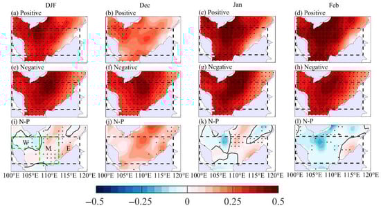 The month-to-month evolution of the winter ESR during different PDO phases is further examined. During the positive PDO phase, the warming trend of SSCS SST gradually intensifies from December to February under the influence of El Niño (Figure 4b–d). In contrast, during the negative PDO phase, the SST warming in the SSCS becomes significant in December, peaks in January, and weakens by February (Figure 4f–h). Consequently, in the N-P composite, the entire SSCS exhibits notable positive SST anomalies in December, particularly in the central and eastern regions, with a maximum anomaly of 0.25 °C (Figure 4i). However, in January of the following year, the spatial distribution of SST anomalies displays a “west-cooling and east-warming” dipole pattern, with the boundary between cold and warm anomalies located near 107° E. The western region experiences a minimum anomaly of −0.2 °C, while the central and eastern regions exhibit a maximum of 0.2 °C (Figure 4k). By February of the following year, the cold-warm boundary shifts eastward to approximately 112° E, and the cold SST anomalies intensify, reaching a minimum of −0.25 °C (Figure 4l). These results indicate that the “west-cooling and east-warming” spatial pattern becomes increasingly pronounced from December to February in the N-P composite.
