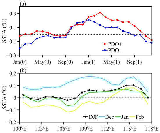 The following supporting information can be downloaded at https://www.mdpi.com/article/10.3390/jmse13091741/s1. Figure S1: Lead-lag correlations between the D(0)J(1)F(1) SSCS SST anomalies and 3-month running mean Niño-3.4 index from 1900 to 2023; Figure S2: Regression anomalies of December(0), January(1) and February(1) SST (shading; °C) with respect to the Niño-3.4 index during the (a,b,c) positive PDO phase, (d,e,f) negative PDO phase and (g,h,i) N-P. Stippling represents anomalies above the 95% confidence level.