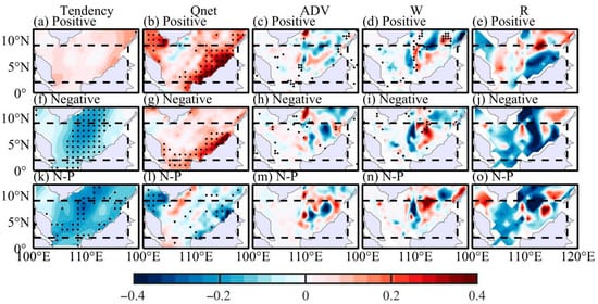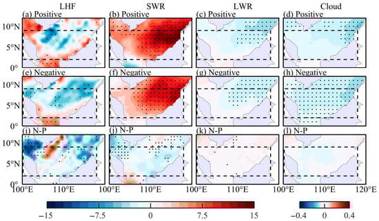 The temporal evolution of winter thermodynamical processes across different regions of the SSCS (Figure 8 and Figure 9) can be further elaborated as follows: in the N-P composite, the western region of the SSCS exhibits a significant positive anomaly in the latent heat flux (0.3 °C/month) during December, which substantially exceeds the negative anomaly of the vertical entrainment term (−0.003 °C/month). Concurrently, the residual term dominates the cooling tendency of SST, while the negative horizontal heat advection term exerts a relatively minor influence. Collectively, these factors lead to the anomalous variation in SST tendency in this region (Figure 8a). Following January of the subsequent year, the latent heat flux shifts from positive to negative, signaling the onset of the cooling tendency in the western region, while the vertical entrainment term starts to depress the cooling tendency. By February of the following year, the negative latent heat flux amplifies (−0.21 °C/month), and the evaporative cooling effect reaches its peak. This process significantly amplified the SST cooling tendency in the western part of the SSCS in synergy with the vertical entrainment term.