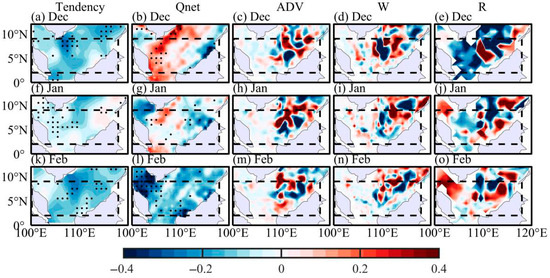 In the central region, the significant cooling tendency of SST in December is primarily attributed to the vertical entrainment term (−0.12 °C/month) and the horizontal heat advection term plays a secondary role. In January of the following year, due to the reduction in negative vertical entrainment term, the cooling SST tendency reduces to −0.06 °C/month. By February, the latent heat flux exhibits a sharp decrease, and the net surface heat flux term shifts from positive to negative. This shift establishes a synergistic cooling mechanism involving three key components—the horizontal heat advection, vertical entrainment, and net surface heat flux terms—that collectively drive a pronounced SST cooling tendency.