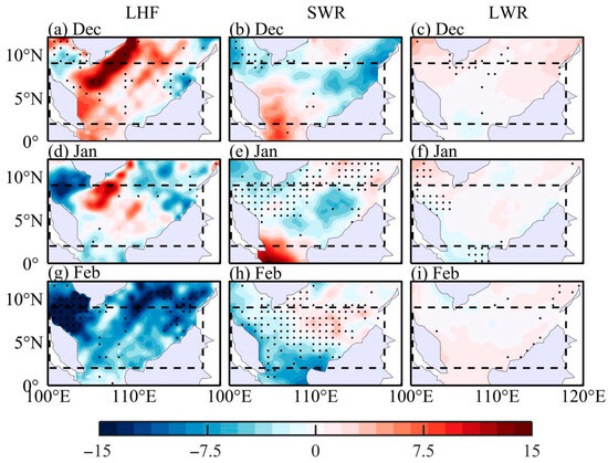 Similarly to Figure 6g–i, but for December (a–c), January (d–f) and February (g–i) during N-P. The left, middle and right volumes represent latent heat flux (LHF), shortwave radiation (SWR) and longwave radiation (LWR), respectively. Unit is W/m2.