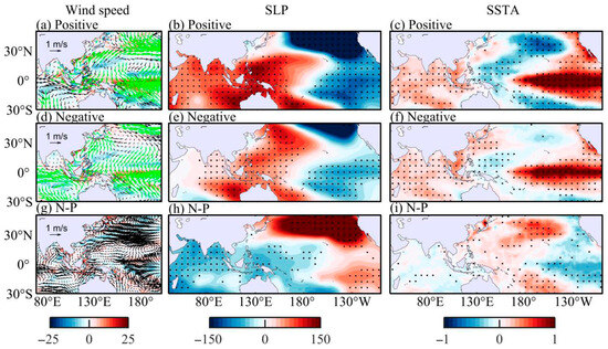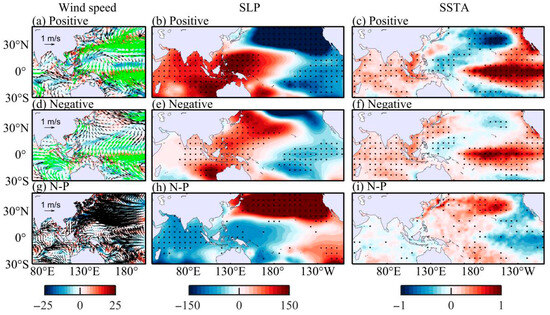 Similarly to Figure 10, but for December (0). Composite anomalies of December surface winds (vector; m/s) with curl (shading; 10−5/s) (a,d,g), sea level pressure (shading; Pa) (b,e,h) and SST (shading; °C) (c,f,i) in (a–c) positive PDO phase, (d–f) negative PDO phase and (g–i) N-P.