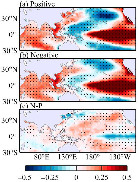 Here, N1 and N2 represent the number of El Niño events during positive and negative phases of the PDO, respectively, over the period 1900–2023. This phase-compositing approach effectively contrasts the differential impacts of El Niño on SSCS SST under varying PDO phases, thereby elucidating PDO’s decadal modulation mechanism on the ESR.