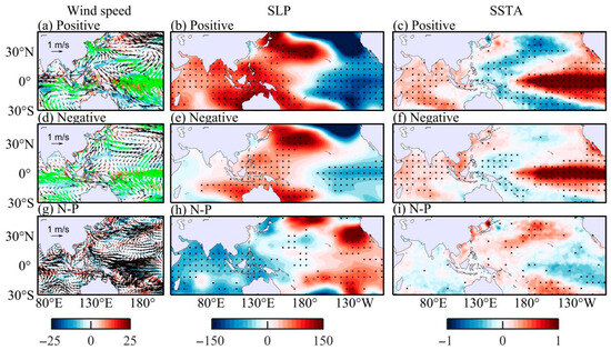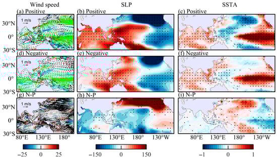 Similarly to Figure 10, but for February (1). Composite anomalies of February surface winds (vector; m/s) with curl (shading; 10−5/s) (a,d,g), sea level pressure (shading; Pa) (b,e,h) and SST (shading; °C) (c,f,i) in (a–c) positive PDO phase, (d–f) negative PDO phase and (g–i) N-P.