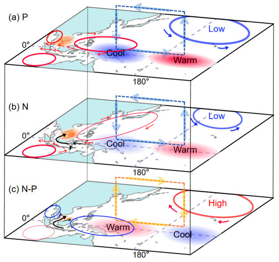 However, for N-P, the zonal distribution of the winter SSCS SSTA is non-uniform, displaying a distinct anomalous dipole pattern of “west-cooling and east-warming”. This mechanism is explained through heat budget analysis, composite analysis, and regression analysis. During the positive PDO phase, the amplified El Niño forces a cold SSTA in the western Pacific through anomalous Walker circulation. This teleconnection cascade strengthens and westward-extends the PSAC, dynamically coupled with the intensified Aleutian low. Concurrently, the NIOAC and SEIOAC emerge as coordinated components of this hemispheric-scale adjustment. In contrast, the negative PDO attenuates El Niño’s amplitude, reducing the western Pacific cold SSTA magnitude. Consequently, the PSAC weakens and shifts northeastward, accompanying the Aleutian low’s decline, while the NIOAC dissipates and the SEIOAC maintains remarkable stability. Such multi-anticyclone reconfiguration fundamentally modulates meridional wind patterns over the SSCS, generating persistent southerly/southwesterly wind anomalies for N-P epochs.