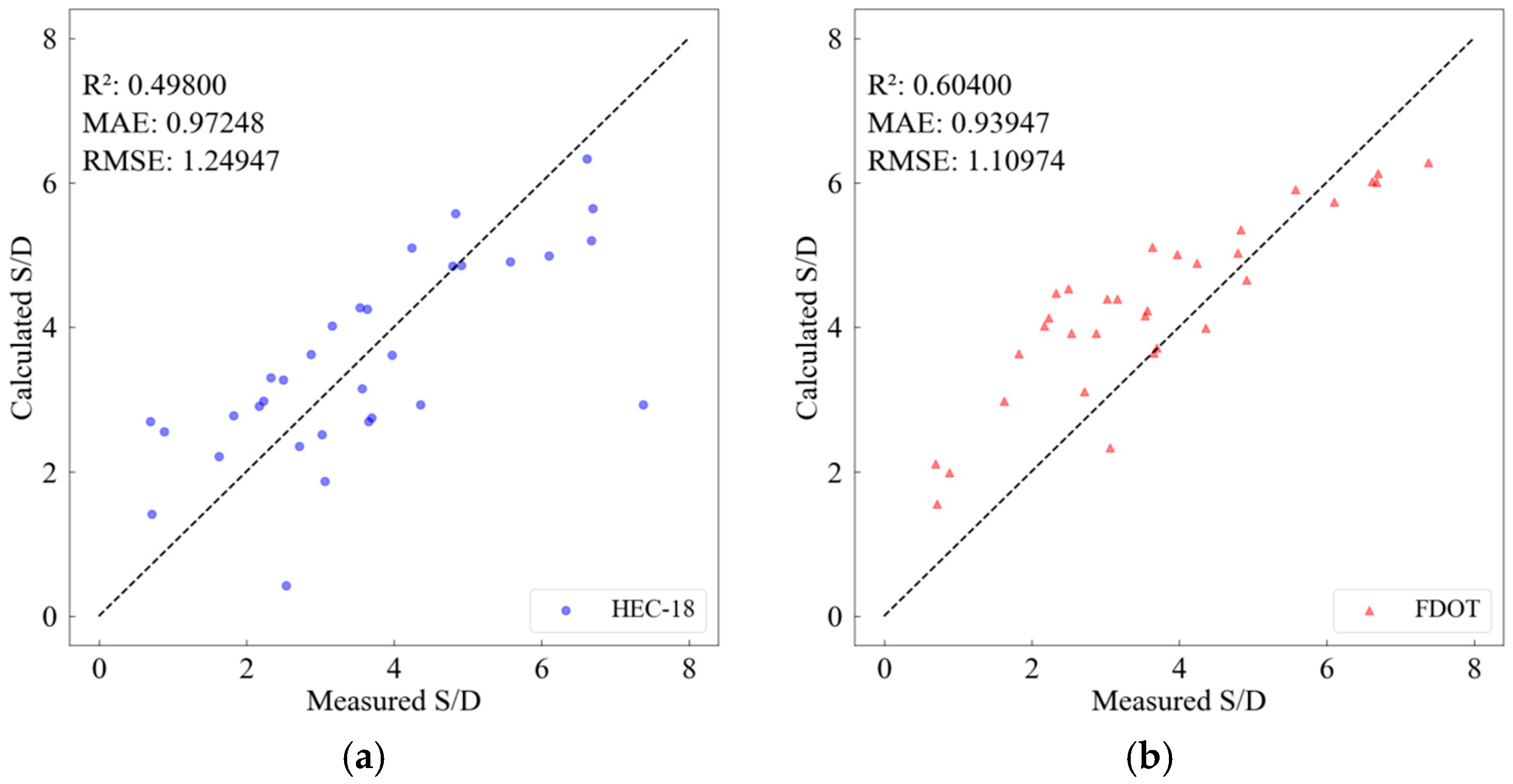 - Nandi, B.; Das, S. Developing new equations for maximum scour depth near tandem, side-by-side, and eccentric piers. Can. J. Civ. Eng. 2025, 52, 1030–1044. [Google Scholar] [CrossRef]