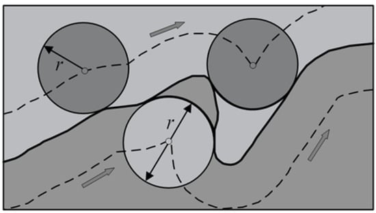 As a common method for seafloor topography mapping, the rolling ball transformation can buffer terrain undulation while recognizing features. For any seafloor topography surface, the rolling ball radius is set to r. During positive rolling ball transformation, a smooth ball rolls over the terrain surface. The trajectory of the ball’s center forms the upper buffer zone surface. Then, the lower buffer zone surface of the upper surface is constructed, which is the lower edge of the positive rolling ball trajectory (Figure 1). This creates the transformed terrain surface. Negative rolling ball transformation works in the opposite manner [23,25,26,27]. By adjusting r in either transformation, we can amplify or diminish certain terrain features. This helps achieve terrain buffering goals such as preserving convexity while reducing concavity, or vice versa.