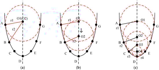 Building on this, Zhang et al. [22] proposed that the maximum rolling ball radius during the critical-point state transition in a rolling ball transformation is the critical radius for terrain feature identification. This is based on the data link relationship between the rolling ball contact points and the radius during the transformation. As shown in Figure 2, from sampling point A(G) to D, as the terrain slope and curvature gradients increase, the positive critical rolling ball radius decreases. At point D, the positive critical radius is smallest, indicating that point D is a negative topographic feature point.