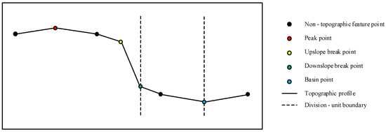 Given that the foot of the continental slope is located in the basal portion of the continental margin, where the slope gradient is greatest, we can use the terrain-recognition feature of the rolling ball transformation. First, we calculate the critical rolling ball radius for each depth point in the DDM. Then, we adopt a reverse engineering approach: we sort the positive critical rolling ball radii and use the point with the maximum positive critical radius as the center of the clustering division unit. Next, we compare the critical radii of this center point and the surrounding natural-neighborhood points to expand the clustering toward areas with negative terrain feature points (where the positive critical rolling ball radius is smallest). This constructs division units until the entire seabed topography area is divided. Finally, we perform intersection operations between the different division units. The resulting intersection lines of their boundaries form the negative topographic feature lines. Specific clustering division methods have been described by Dong et al. [17]. These lines, featuring the maximum terrain curvature on the seabed, consist of only negative topographic feature points, have concave features, and include all of the Basin points [28] and downslope break points. Figure 3 illustrates the types of seabed topography feature points.