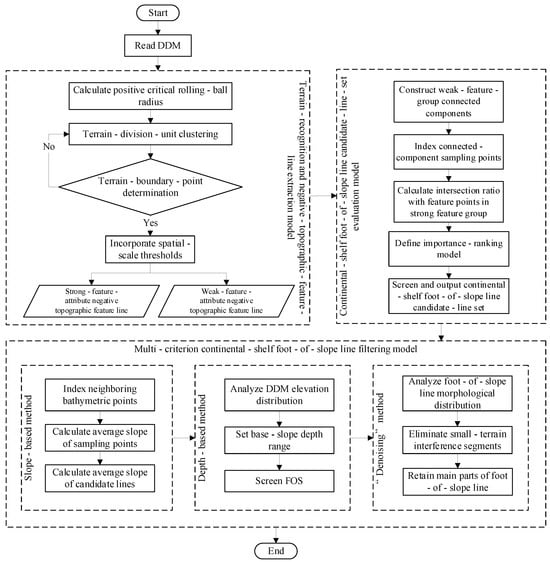 General technical workflow of the precise extraction method of continental margin FOS line considering terrain continuity.
