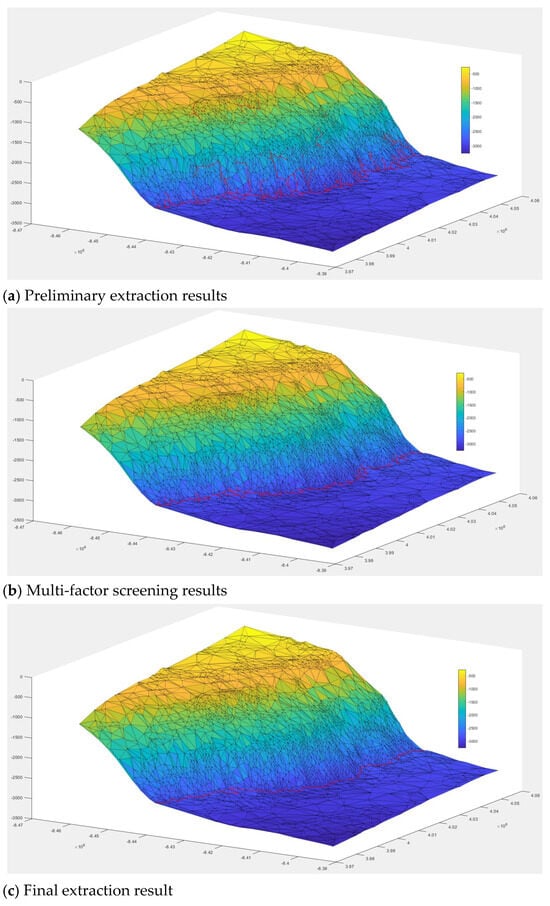 Figure 6 presents the results of the processing steps of the extraction obtained using an importance ranking threshold of 0.72 (Table 1). Figure 6a presents the preliminary results after importance ranking. Figure 6b presents the results after multi-criteria filtering (including slope-based, depth-based, and denoising methods). Figure 6c retains only the main part of the continental margin FOS line from Figure 6b. In Table 1 and Figure 6, the red segments denote the retained negative topographic feature lines.
