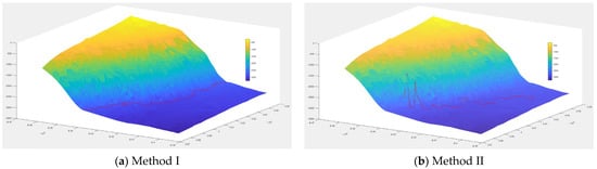 SURFER visualization of extraction results obtained using Methods I and II. (a) Two-dimensional graph of the FOS extraction results. (b) Three-dimensional graph of the FOS extraction results.