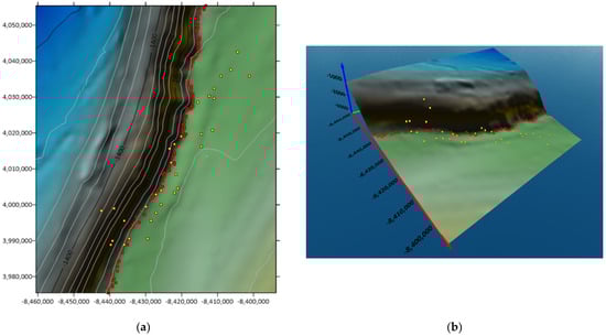 To verify the applicability of the proposed algorithm in delineating the outer limits of the continental margin and to achieve precise extraction of the continental margin FOS line while considering topographic continuity, we conducted a comparative analysis experiment. In this experiment, we used real continental margin terrain image dataset A. The extraction results were visualized using MATLAB R2023a and Surfer 23 software, and a comparative analysis was conducted using the FOS identification results obtained utilizing the widely used CARIS Law of the Sea 4.1.1.0 (Caris LOTS) boundary delimitation software (Figure 7 and Figure 8). The proposed method is referred to as Method I, and the process of identifying the FOS and drawing the FOS line in Caris LOTS is designated as Method II. Since Caris LOTS does not directly generate continental margin FOS lines, manual terrain-profile operations in the Caris LOTS software were required. The D–P algorithm was used to analyze the FOS points on the profile curves, followed by report generation and recording of the FOS point coordinates for result visualization in Surfer and MATLAB. It should be noted that Caris LOTS did not accurately identify the FOS positions in every profile. Therefore, during the FOS identification process conducted on profile curves in Caris LOTS, the D–P algorithm was primarily used, supplemented by the Fourier algorithm to ensure that corresponding FOS points were obtained in each selected profile. In the experiment, 33 continental margin terrain profiles and 33 FOS points were generated using Caris LOTS. In Figure 7, the water depth value increases in the direction from the yellow terrain to the blue terrain, and the extracted continental margin FOS line is indicated by a red solid line. In Figure 8, the blue area represents higher-elevation terrain, the green area represents lower-elevation terrain, the red dots indicate the results of Method I for identifying continental margin FOS points, and the yellow dots indicate the results of Method II. And the coordinate system used in Figure 8 is the Mercator projected coordinate system.