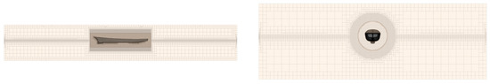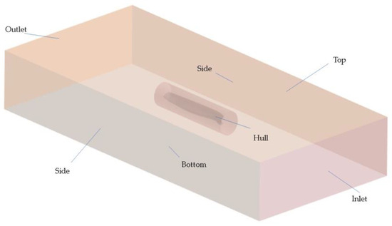 For the computational domain boundaries (Figure 2), a velocity inlet boundary is set in front of the ship, using a uniform incoming flow velocity (set to 0); a pressure outlet boundary is set behind the ship, maintaining the ambient pressure; the sides and top of the computational domain are also set as pressure outlet boundaries and the bottom is set as a no-slip wall boundary. The hull surface adopts the no-slip wall boundary condition. In addition, to avoid the impact of wave reflection on the calculation results, appropriately wide damping wave absorption zones are set on both sides of the computational domain.
