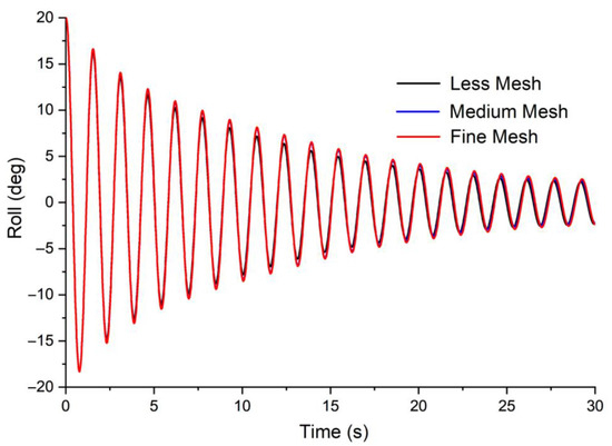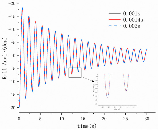 In Figure 6, the time-history calculation results for different time steps are very close. With reference to the grid independence analysis, a convergence analysis of the time steps was conducted, as shown in Figure 7. After 25 s, roll degree of hull enters a relatively stable phase. The time step is more sensitive within a small range, but overall, it does not have a significant impact on the calculation results, , the timesteps satisfy the convergence conditions. A similar pattern can be observed in the grid independence analysis shown in Figure 5. To accelerate the computation, a time step of 0.002 s was selected for subsequent calculations [2].