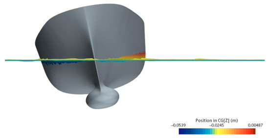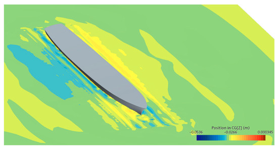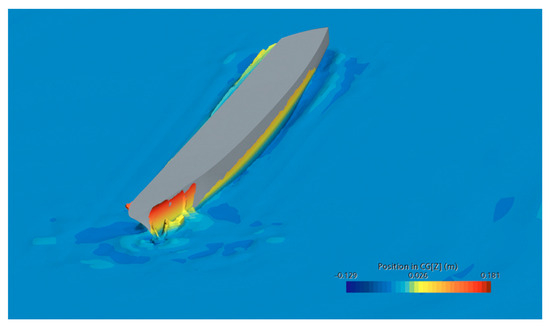 Based on the grid independence study, an overset grid with refinement schemes was used, as shown in Figure 3. The computational domain size was: ahead of the ship, behind the ship, on each side, and a vertical height of . The calculation used 1-DOF. To avoid wave reflection effects, damping wave absorption zones wide were set on both sides. Numerical results for three grid resolutions—coarse (Mesh A, 1.36 million cells), medium (Mesh B, 3.32 million cells), and fine (Mesh C, 5.86 million cells)—are shown in Figure 4. The calculated curves are shown in Figure 5.