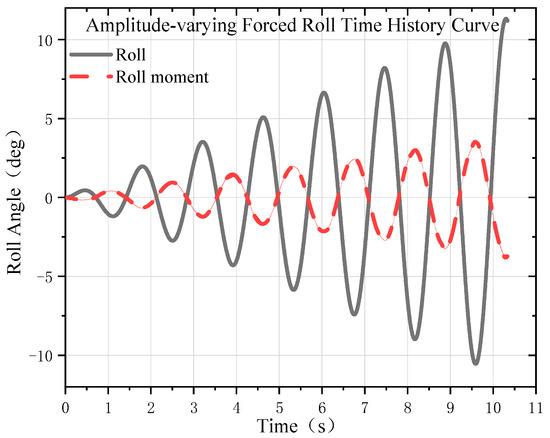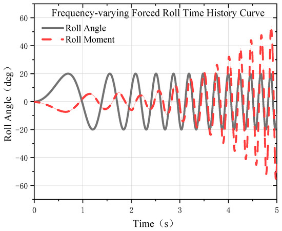 The ship model is subjected to inertial forces, damping forces, restoring forces, and external forces during roll motion. Damping forces include linear and nonlinear components. At small roll angles, the nonlinear damping term is not significant due to low roll angular velocity , but its proportion increases as the angle increases. Since free roll decay tests experience rapid roll angle decay, they are not conducive to solving the nonlinear damping term. This paper uses forced roll tests as the data foundation to solve for the added moment of inertia , linear roll damping , and nonlinear roll damping . The simulation conditions are defined in Table 2.
