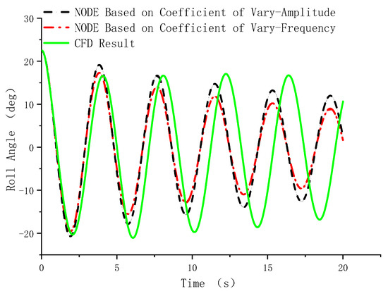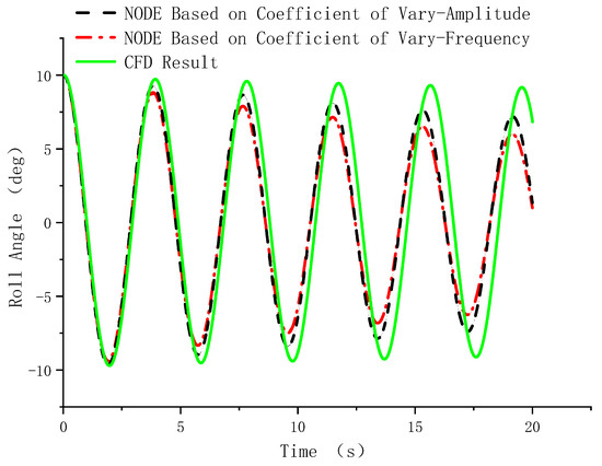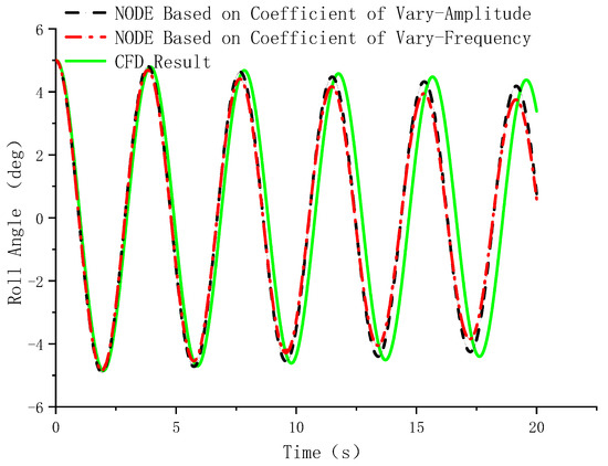 The coefficients from Table 3 for both conditions were input into the NODE model. Prediction time was set to 0–10 s. The integration method chosen was Implicit Adams, with relative tolerance and absolute tolerance . CFD simulations of free decay under different initial roll angles were also performed. Results using coefficients from both conditions and the CFD method are compared in Figure 18, Figure 19 and Figure 20.