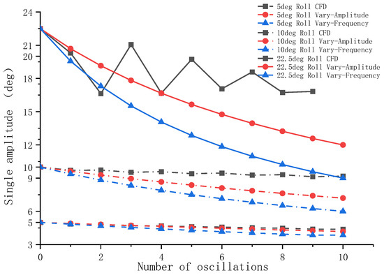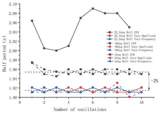 Further analysis of half-period and single amplitude during decay is shown in Figure 21 and Figure 22. In the decay period comparison, the error between NODE and CFD is stable around 2% for small initial angles. At larger angles, CFD-calculated periods show outlier fluctuations which the NODE roll motion model fails to fully capture. This is partly because SVM training sample amplitudes did not reach 22.5°, limiting model adaptability to large angles. Additionally, the DTMB5415 model’s deck approaches immersion at 22.5°, causing green water phenomena and increased computational complexity. In roll amplitude comparison, NODE and CFD results are closer for smaller initial angles, but the error increases over time. Comparatively, results using coefficients solved from variable amplitude forced roll are closer to CFD results than those from variable frequency forced roll.