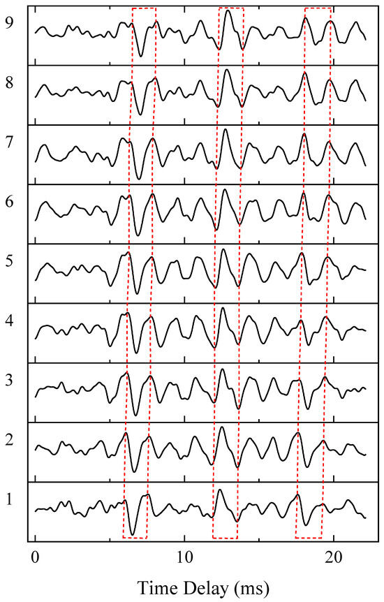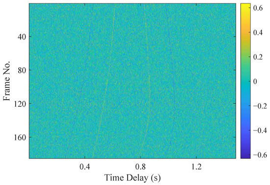 - Similarity. Due to channel effects, the cross-correlation pulses from different propagation paths exhibit distinct deformations compared to the autocorrelation pulse of the source signal. However, pulses corresponding to the same propagation path tend to remain similar across different time frames, as illustrated in Figure 1. Specifically, for the same path indices k and l in Equation (5), shows strong similarity in both polarity and shape. This property facilitates the association of cross-correlation pulses originating from the same path. To quantify pulse similarity, we employ the Structural Similarity Index Measure (SSIM), defined as follows:where and are the mean of the amplitude vectors and , and are their variance, and denotes the covariance term. and are small constants introduced in the SSIM to avoid instability when the denominator approaches zero. The SSIM is computed for every pair of pulses of , and their average is used as the overall similarity score. The energy contribution from pulse similarity is defined as follows:where is the total number of , as described in Table 1.