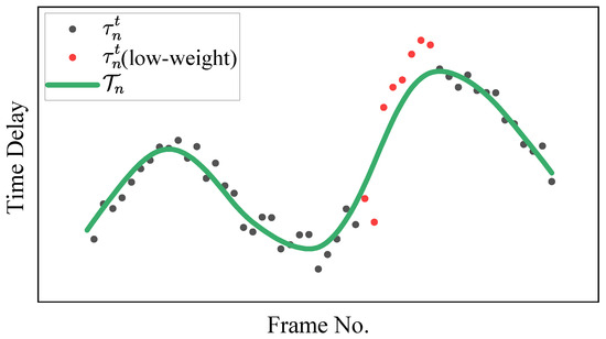 - Data term. Multipath delays vary with the relative motion of the source and hydrophones. Since the movement of the source is continuous, the corresponding delay trajectories are also continuous. The weighted cubic spline interpolation provides an effective means of fitting these delay trajectories by capturing their natural evolution.Figure 2 is a schematic diagram of weighted cubic spline fitting. The observed time delays associated with the n-th trajectory are used to perform trajectory fitting, where the independent variable is the discrete frame index . The fitted trajectory is likewise a function of t, and we denote by the fitted value at frame t.The data term evaluates the accuracy of trajectory fitting by measuring the Euclidean distance between the observations and the estimated trajectory:where represents the weight assigned to each observation, which is correlated with its peak amplitude. The start time and the end time correspond to the indices of the first and last observations in trajectory n, respectively. If an observation does not belong to any trajectory, it is classified as an outlier, ⌀, and assigned a constant cost, . The final formulation of the data term is given by the following equation:The outlier weight is set to a small constant to ensure numerical stability, and the outlier cost is set proportional to the average inlier fitting error.