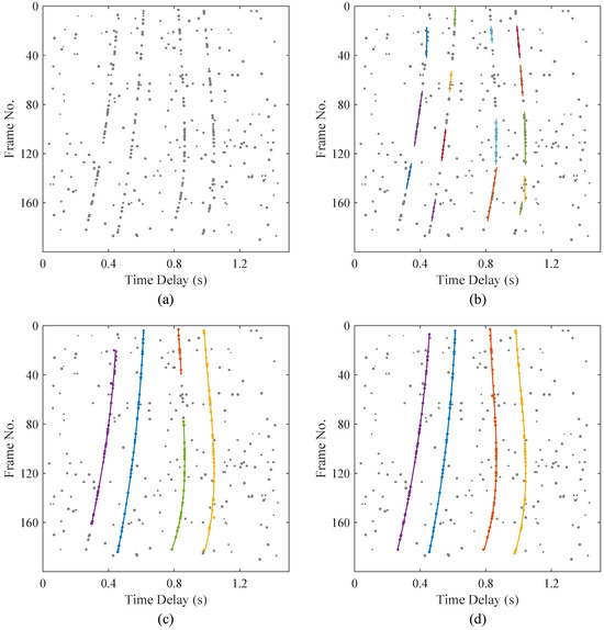 - Trajectory Persistence. The proposed method imposes no strict requirements on the start or end points of a target trajectory; it does not necessarily need to begin at the first frame or terminate at the last frame. However, longer trajectories are encouraged. Due to the influence of random noise and other strong interferences, correlation pulses may be completely submerged or become indistinguishable at certain moments or over short time intervals, leading to the disappearance of the targets. In such cases, multiple disconnected short trajectories are often formed, which is not conducive to tracking the trajectories. Assigning a higher cost to short trajectories helps reconnect fragmented tracks and prevents unnecessary identity switches. is used to adjust the importance of trajectory persistence to the energy function, usually taken as a fixed constant (0.5 in our experiments), which reflects encouragement for long trajectories and punishment for short trajectories: