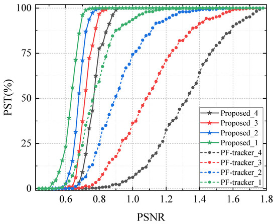 - High-order data fidelity. Equation (11) defines the requirement for trajectories to approximate the observations as closely as possible. Nevertheless, considering that targets may be intermittently obscured by noise, it is not mandatory for each frame within a trajectory duration to include a corresponding observation. To mitigate potential errors in trajectory fitting and the merging of short tracks, a constraint on the maximum permissible gap between successive observations is imposed:where denotes the maximum number of consecutive frames in which no observation is associated with the trajectory . The scaling factor is introduced to penalize long gaps and is set as a constant (empirically chosen in the range of ).