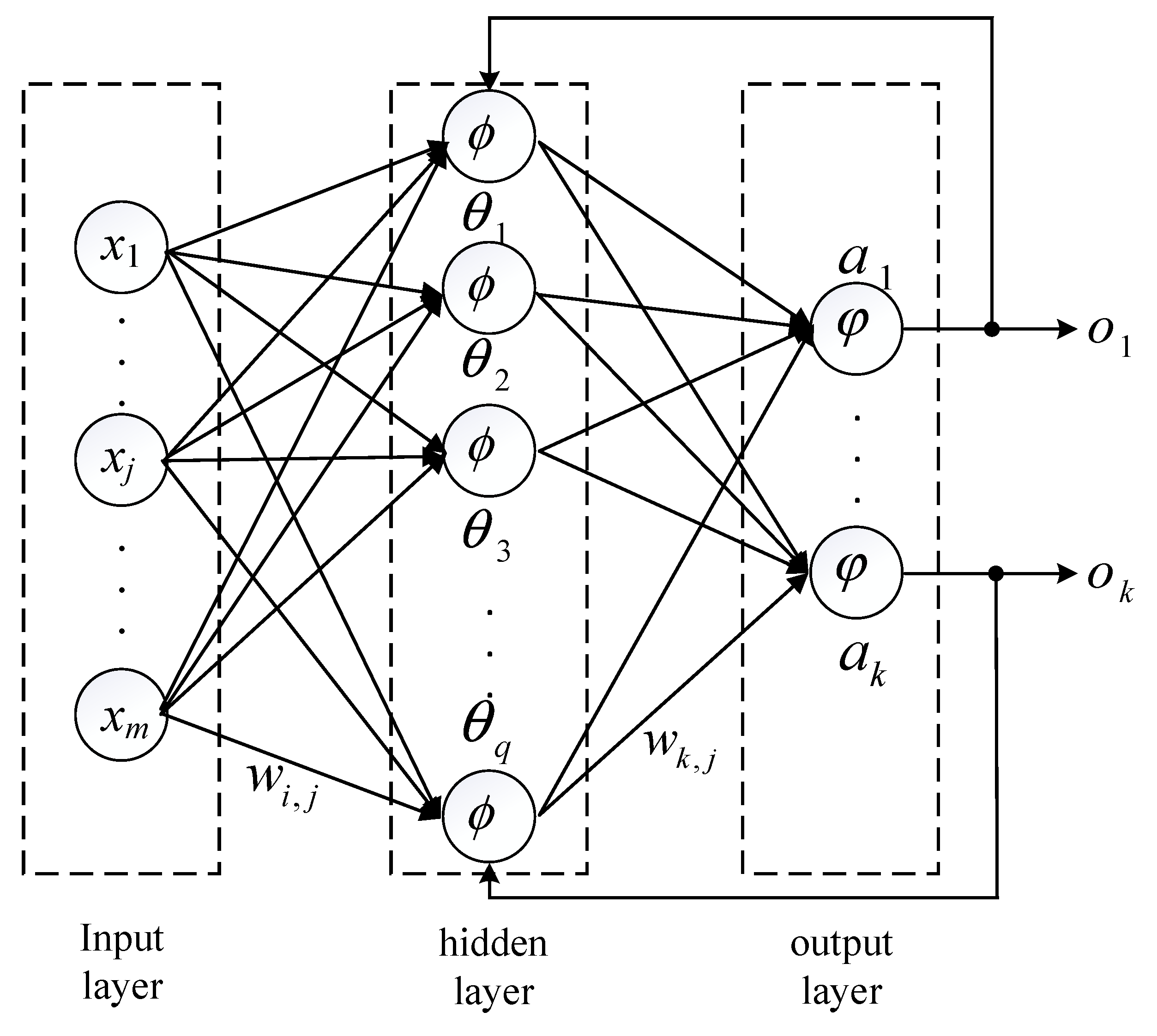 In the equation, and correspond to the activation functions of the hidden and output layers, respectively; and correspond to the thresholds of the hidden and output layer neuron nodes, respectively; is the connection weight between the th neuron of the hidden layer and the th neuron of the output layer, where ; is the input value of the th neuron in the input layer; is the output value of the th neuron in the output layer; and is the connection weight between the th neuron in the input layer and the th neuron in the hidden layer, where , .