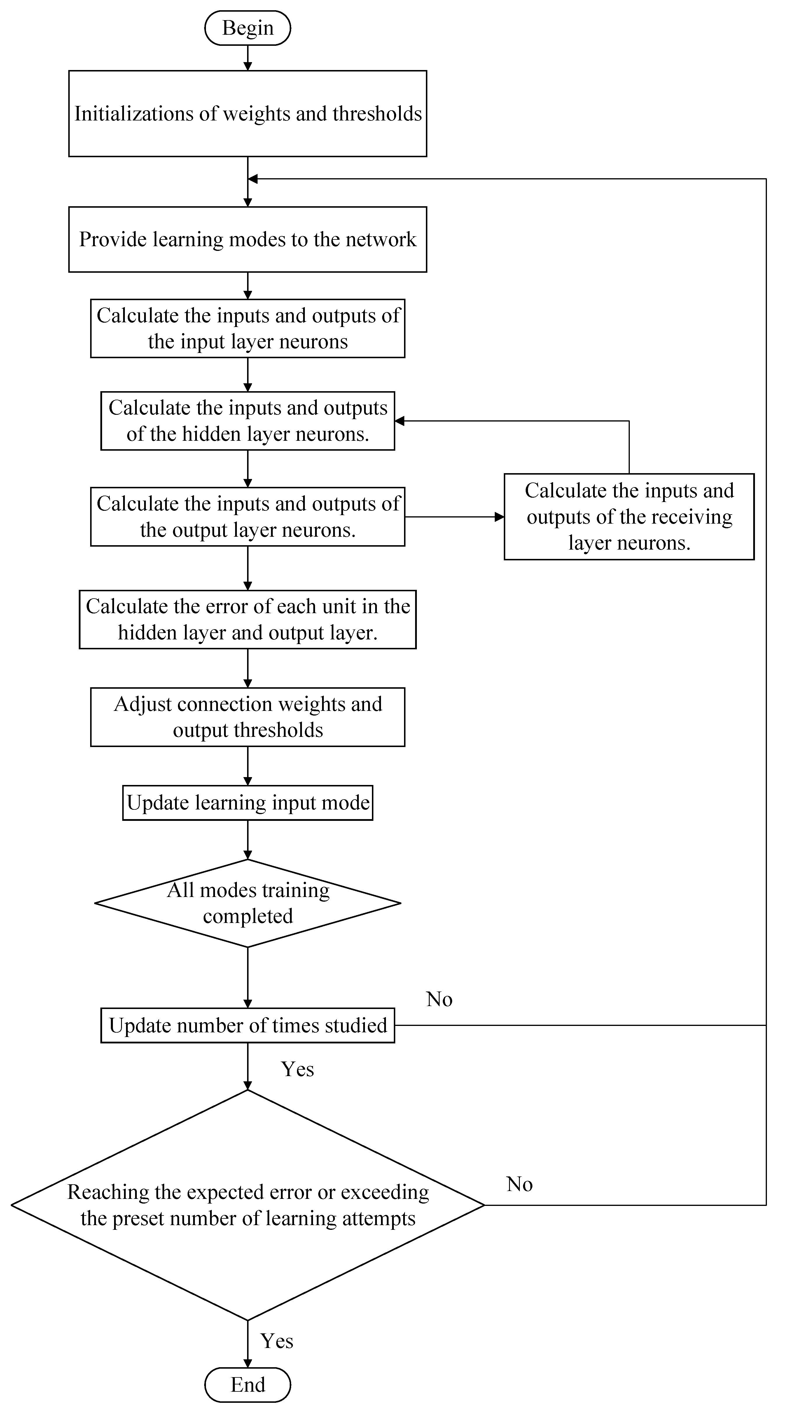 23]. The network calculates the error between the actual and expected output using a loss function and adjusts the connection weights and thresholds between neurons in each layer using the gradient descent method based on the error gradient, causing the error to decrease along the gradient direction. This process of forward propagation and backpropagation is repeated continuously. In theory, the BP neural network can approximate any nonlinear function with arbitrary precision, enabling it to handle various complex nonlinear problems.