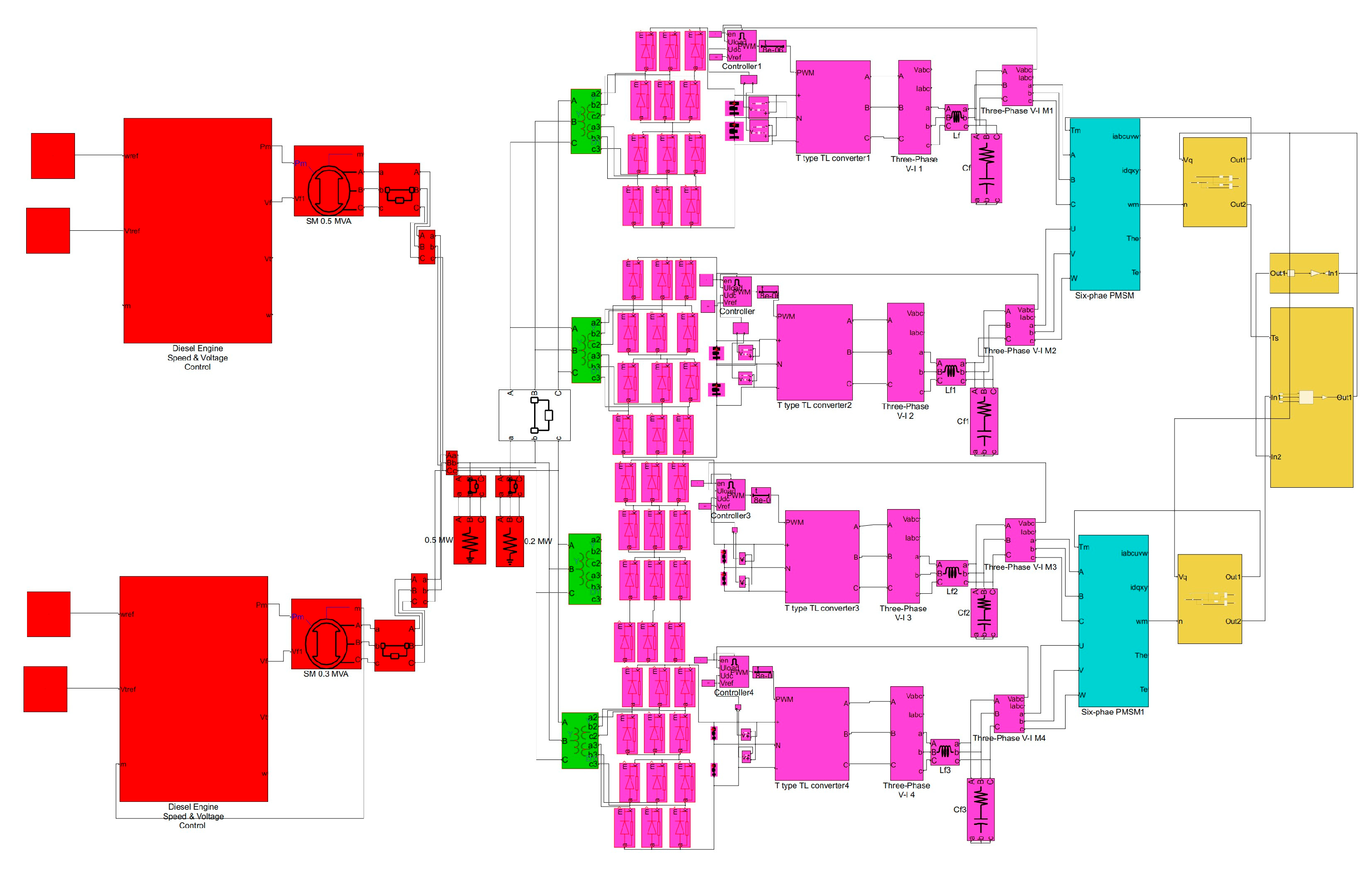 Figure 9, the red section represents the simulation model of the diesel generator set on board the vessel, the green section represents the simulation model of the rectifier transformer, the pink section represents the simulation model of the frequency converter, the cyan section represents the simulation model of the propulsion motor and the yellow section represents the simulation model of the propeller.