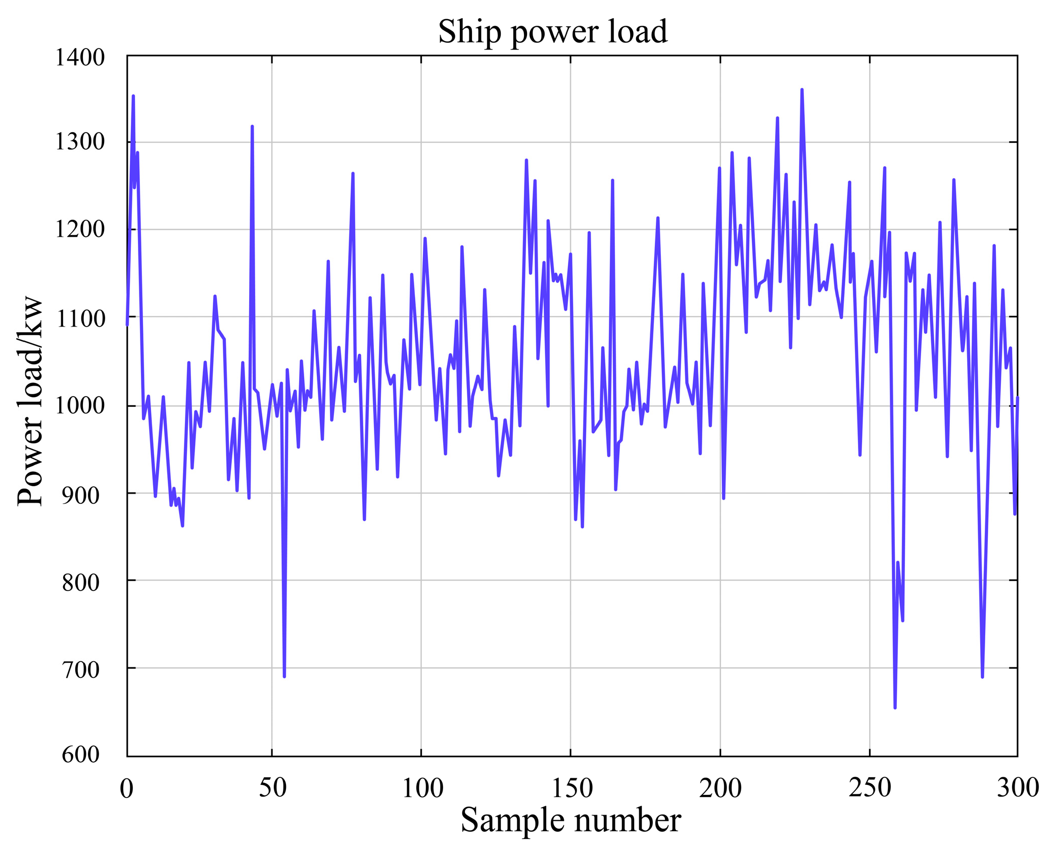 In the course of the experiment, the load statistics of a solitary propulsion motor and propeller were measured over a period of 1500 s. The 60 Hz load motor used to drive the propeller was utilized in the simulation of fluctuations in electrical load under various operational conditions, including forward movement, mooring, reverse thrust, and towing. This was achieved by altering parameters such as rotational speed, drag force, water flow velocity, and wind speed. This process yielded 300 sets of sample data. The ensuing sample results are illustrated in