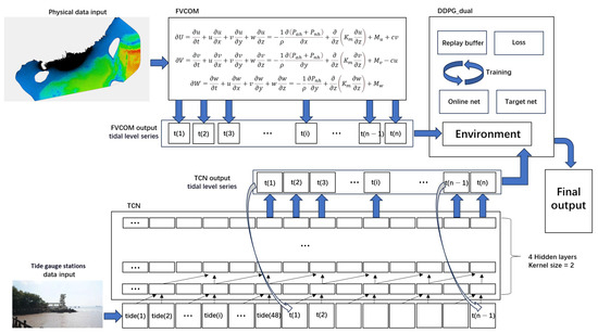 The architectural design of the DNR model is schematically presented in Figure 1. This integrated framework comprises three distinct modules operating in synergy. The foundational layer consists of two specialized base models: a Temporal Convolutional Network (TCN) and the FVCOM hydrodynamic model. These models independently generate tidal predictions for identical spatiotemporal coordinates, with their outputs and corresponding ground truth values aggregated to construct a training dataset for the meta-learning DDPG_dual module. The operational workflow proceeds as follows: Initially, TCN processes temporal–contextual features to derive tidal forecasts, while FVCOM leverages hydrodynamic principles for complementary predictions. Subsequently, the DDPG_dual meta-learner dynamically fuses these heterogeneous outputs to produce the final unified prediction. The technical details of each component are elaborated below.