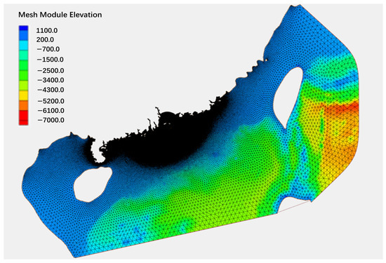 where x, y, z, u, v, and w represent the three coordinate axes in the Cartesian coordinate system and their corresponding velocity components, respectively. denotes density; represents hydrostatic pressure; denotes non-hydrostatic pressure; c is the Coriolis parameter. is the vertical eddy diffusion coefficient. , , and are the momentum components in the three directions. This dynamic process is constructed on an unstructured grid to simulate wave propagation. To achieve this, a refined grid was established for the simulated water area, as shown in Figure 2 [38].