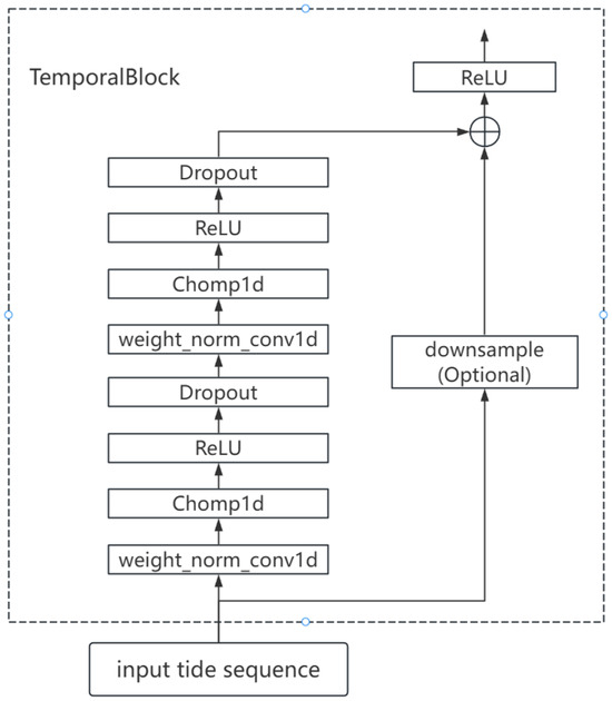 where is the output predicting the tidal level at time , and are the tidal input sequence of length k, consisting of the tidal levels at time t and earlier. is a downsample layer, which is essentially a 1D convolutional layer that is used only when the input and output dimensions of the hidden layer are not equal. The purpose is to ensure dimensionality matching when performing residual connections. stands for Temporal Block, which can be specifically described by the following equation: