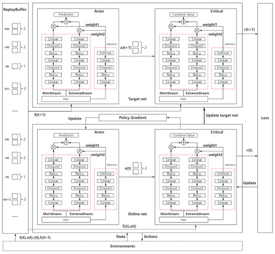 The DDPG_dual structure used in this study is shown in Figure 4. The online network and the target network are constructed separately, with both networks having identical structures. The online network is used for real-time decision making, while the target network is used for training and learning. The Actor network and Critic network are deployed on both the online and target networks. The Actor network is responsible for calculating actions based on the environmental state. The design of the Critic network is intended to assist in evaluating actions, as the environment cannot always provide concise feedback for each action step. In DDPG_dual, the action is formed through a dual-channel network and an attention gate control network. The dual-channel network consists of the mainstream network and the extreme flow network. Note that, the dashed red region are the two parallel branches which are a main stream and an extreme stream. The mainstream network handles regular tidal level changes, while the extreme flow network specializes in processing extreme regions such as wave peaks and troughs. The outputs of these two networks are dynamically fused through the attention gate control network. The Actor network receives the current environmental state and outputs the final tidal level prediction, . The score output from the Critic network, , comprehensively considers the influences of the current state and action . This is also formed through the dual-channel network and the attention gate control network. The action is fed back into the environment to obtain the reward information and transition to the next state . The data generated through this process are stored in the experience replay buffer for parameter updates across the entire DDPG_dual.