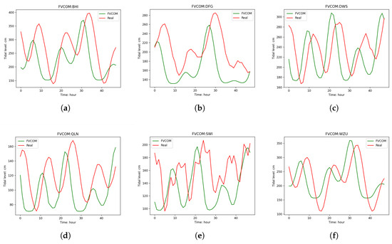 Firstly, we used the FVCOM model to predict the tidal levels at six tidal stations. Since FVCOM starts simulations in cold-start mode, to ensure the accuracy of the prediction results, we discarded the first 48 h of data after the simulation began and selected the subsequent 312 h of data as the FVCOM prediction results. Among these, for the five stations used for fusion model training, we specifically selected the last 48 h of data, which were not involved in the fusion model training, for display (the previous 250 h of prediction data were used for fusion model training). For station BHI, which was not involved in fusion model training, we displayed its complete 312-h prediction results. In Figure 6, the predicted results for each station are shown by green lines, while the corresponding actual tidal level data is presented by red lines.