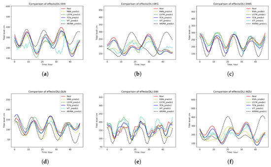 First, we compared the performance between the deep learning models and the ARIMA model. The deep learning models included TCN (Temporal Convolutional Network), RNN (Recurrent Neural Network), LSTM (Long Short-Term Memory Network), and VIT (Vision Transformer). We used these models to predict the tidal levels at six tidal stations, with the performance metrics of the models for each station shown in Table 6. For each station, the numbers marked in red represent the minimum value for the corresponding model on that metric (note that for MAE, which is Mean Absolute Error, and RMSE, which is Root Mean Square Error, smaller values are better). The numbers marked in blue represent the maximum value for the corresponding model on that metric (where Pearson correlation coefficient and NSE, the Nash–Sutcliffe Efficiency, are better when larger).